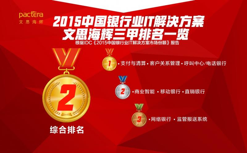 近日,国际知名信息产业研究机构IDC公布了中国银行业IT解决方案2015市场份额排名。文思海辉的市场占比位居第二,连续两年成为中国第二大银行业解决方案服务提供商,并在支付与清算、呼叫中心、客户关系管理多个细分领域高居榜首,充分印证了文思海辉数字金融解决方案领导者之一的品牌地位。