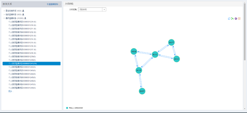 通过深度优先搜索算法对担保关系进行遍历,对联保、互保的特殊结构进行识别,可以直观刻画出担保圈规模边界和特殊的网络拓扑结构,也为谈论担保圈风险的防范和化解提供了技术支持。同时,对于担保圈风险的识别,还包括对于担保圈节点层面以及社群层面的测量体系;通过识别担保圈的风险情况,掌握风险特征,寻找关键企业,定位拆解环节,提高担保圈处置的针对性。通过分析联保互保的特殊结构,利用复杂网络技术将担保圈按其担保链条形态分为链型结构、星型结构、环形结构,这也是文思海辉·金融基于银行担保业务抽象出的特殊担保结构。