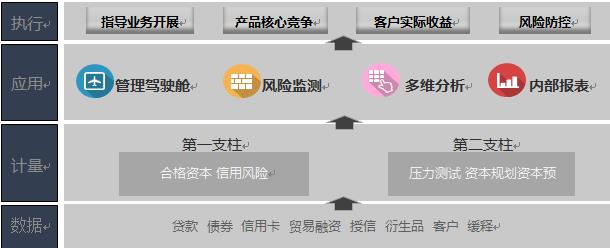 满足资本管理办法的第一支柱。通过权重法和内评法实现全行各级资本充足率的计算。同时提供明细级风险加权资产计量结果,为后续内部管理和资本管理办法的第二支柱准备基础数据。满足资本管理办法的第二支柱。根据资本规划、压力测试等实现行内资本充足的评估以及提供相应的预警方案。