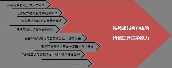 在运营模式上:促进从“账务处理、交易型”向“营销服务型、体验式”持续转变;