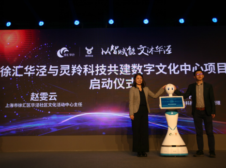 现场,华泾镇文化中心主任赵雯云与灵羚科技高级经理陶然走上台,共同启动了未来文化中心的形象大使——机器人“小泾”,标志双方共建的数字文化中心项目正式启动。