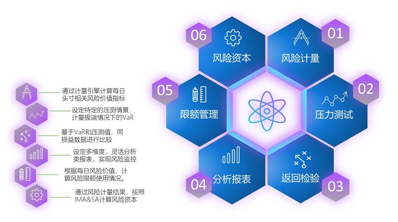 文思海辉·金融市场风险管理系统主要包括一个平台,两大模块,六大基础功能,通过定制开发快速满足监管要求。针对金融市场业务的特点以及市场风险计量的要求,公司搭建了包括数据集市与分析、市场风险计量两大模块的金融市场业务数据加工和分析平台,可整合成熟的风险计量引擎,计算每日相关风险价值指标;并设定压测情景,计量极端情况下的风险指标,测算最大的损失的可能性;基于风险指标计量结果,将同损益数据进行比较,检查风险计量模型的准确性;还可提供限额录入窗口,实现限额数据的系统化管理;对风险计量指标进行多维分析,定制相应的功能实现BI数据分析,包括数据录入、风险指标的多维灵活展示,还可自动生成经营分析类、监管类报表等各类风险报告。