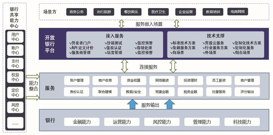 文思海辉金融多年来紧跟行业发展态势结合多年国内银行业的运营经验,形成了从规划、设计、建设到运营的一整套开放银行平台解决方案,可支持生态共建,实现各类金融、泛金融、非金融服务聚合,通过建立API共享中心,全面助力银行开放自身的业务资源,提升服务水平和盈利能力,围绕客户需求和应用场景,将金融服务无缝融合到日常生活和企业运营中,让金融服务无处不在,助力银行客户持续拓展和深化运营能力,实现服务升级和价值链重构。