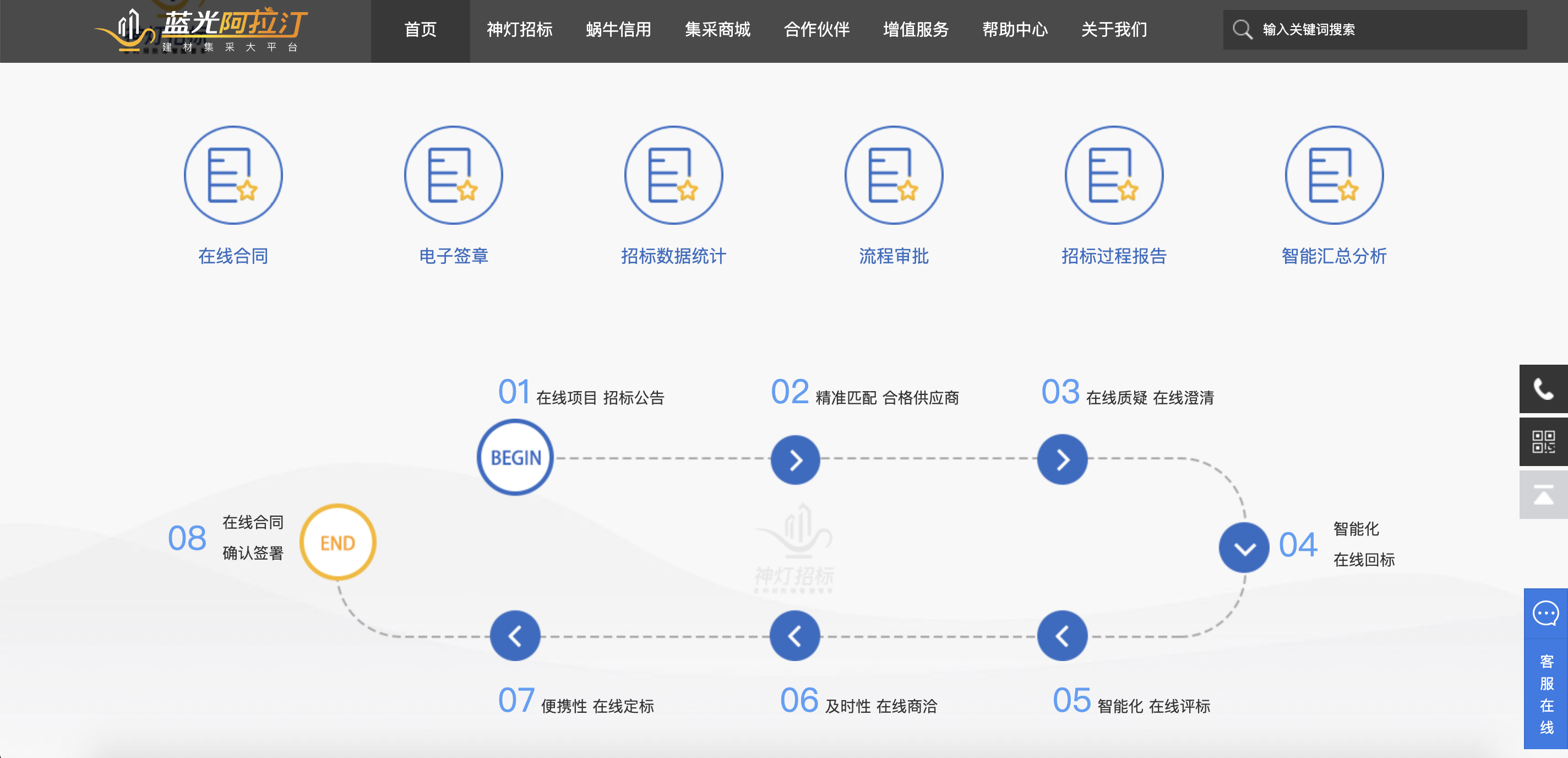 智能招投标系统共分为招标、评标、定标三大环节,招标过程自动生成招标文件、供需双方自动匹配、对报名企业自动审核、发起企业考察众包任务;评标环节对可量化参数自动打分、行业专家库随机筛选评标专家、自动核对投标保证金、视频答疑、澄清、在线商务洽谈;定标环节在线签订电子合同、追加补充协议、中标结果自动公示并同步至其他招标公示网站、自动退还保证金、履约情况预警。这些所有的过程都“有迹可循”,公开、透明,智能化、标准化、一体化管理让阿拉汀平台高效快速的运转。