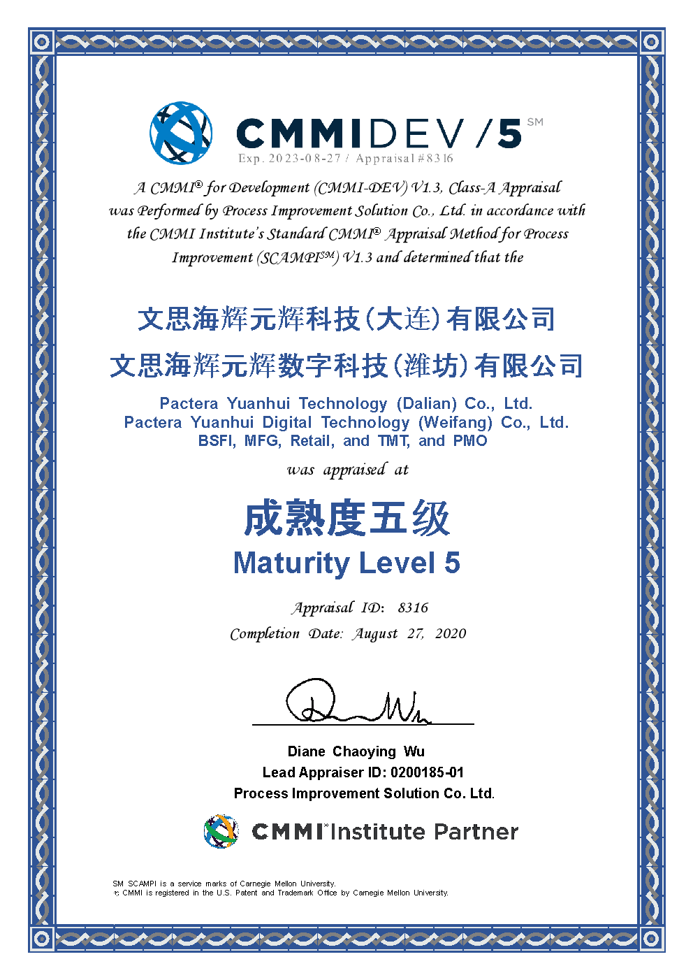 10月21日,文思海辉元辉科技(大连)有限公司和文思海辉元辉数字科技(潍坊)有限公司通过全球软件领域最高级别CMMI 5级评估认证,标志着文思海辉在过程管理能力、软件技术研发能力、项目管理能力等方面都持续保持着优化管理级的国际先进水平,同时也展现了文思海辉能为行业提供更成熟、更高质量的产品和解决方案的强大实力。