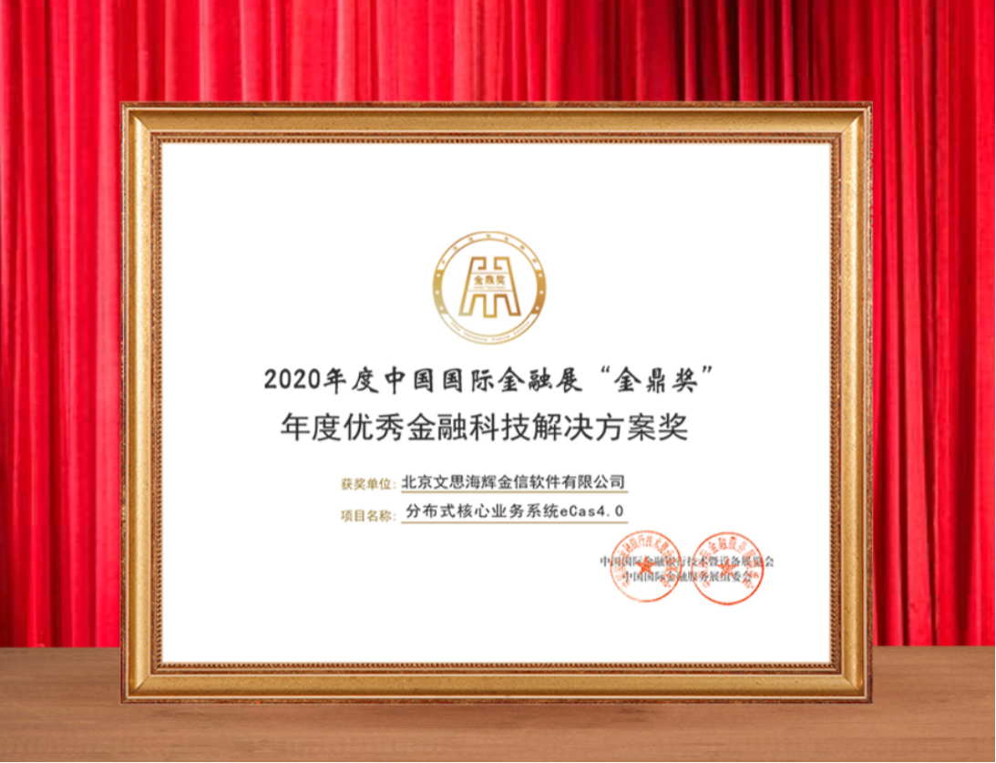 12月25日,2020年度中国国际金融展“金鼎奖”评选结果隆重揭晓,其中由文思海辉金融自主研发的“分布式核心业务系统eCas4.0”凭借技术创新力、品牌影响力、成功应用案例等多方面优势,获得专业评委的一致认可,在众多解决方案中脱颖而出,斩获年度优秀金融科技解决方案奖。