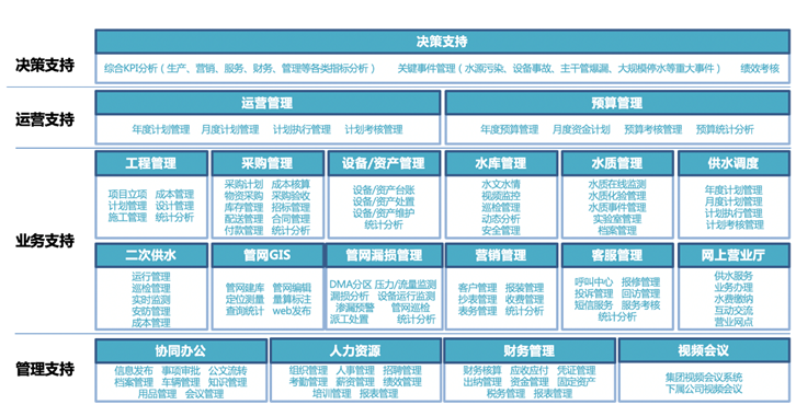 - 业务支持:管理系统含导航图、设备管理、报表管理、水质管理、成本与指标统计分析、报警管理、现场场景虚拟现实、安全管理、远程监控、化验室管理、绩效管理、风险评估、运行最优方案、知识共享中心、移动客户端等;管网系统含导航图、自来水管网GIS系统、自来水SCADA系统、自来水DMA分区计量系统、自来水管网运维系统、自来水管网分析、自来水营收系统、报警管理、移动客户端等。